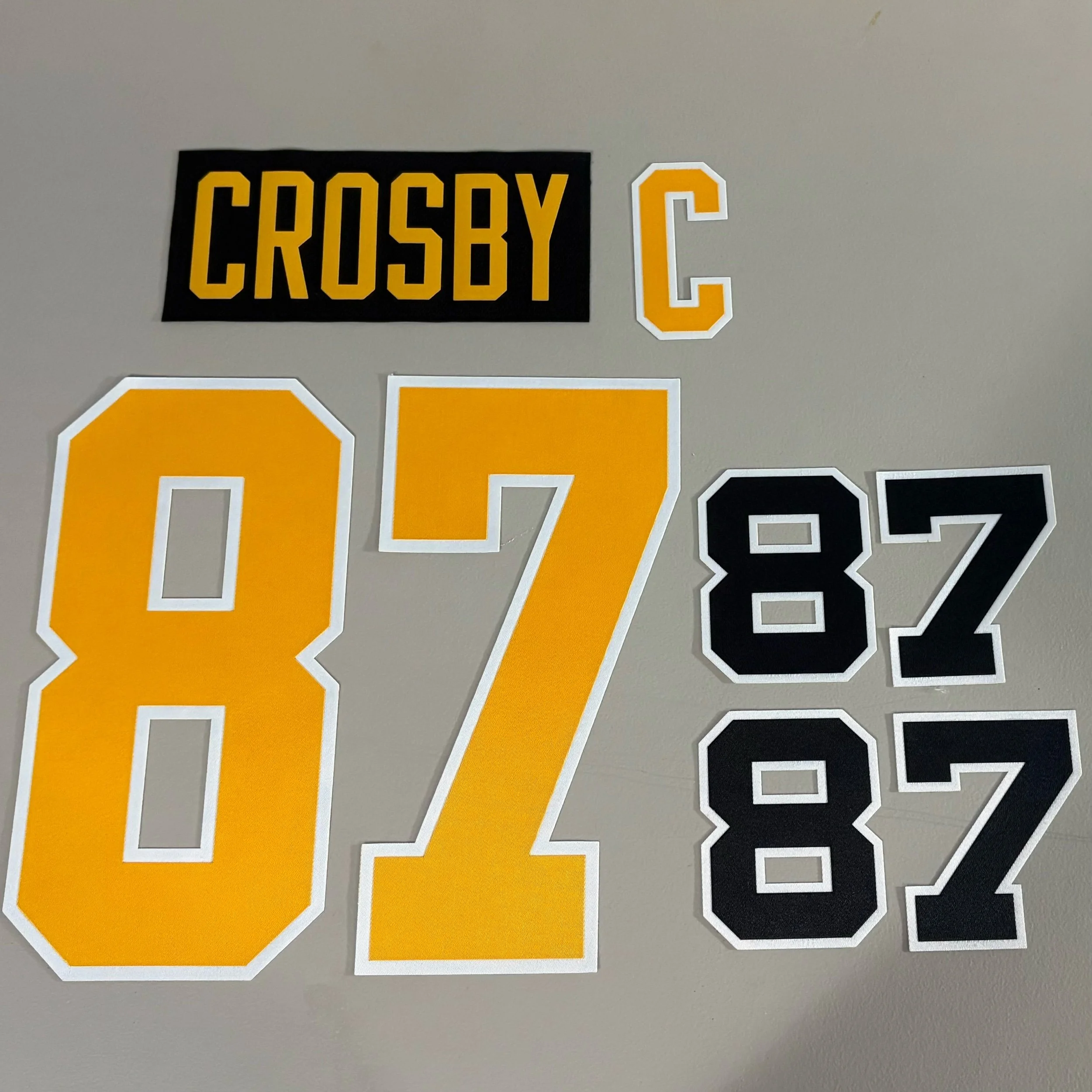 Purchase includes 3 layer kiss-cut back numbers, sleeve numbers, name letters. Name is on an airknit nameplate. Correct team-spec glacier material is used.